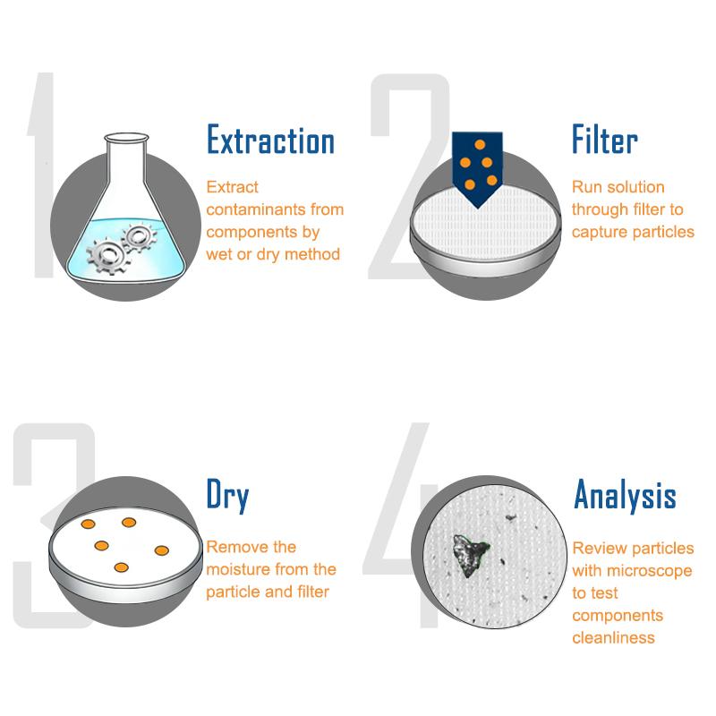 Place the dried and cooled filter membrane in the filter membrane fixing fixture, use a microscope to perform analysis and scanning, automatically identify metal particles, non-metal particles, and fibers, and generate a cleanliness test report with one click.